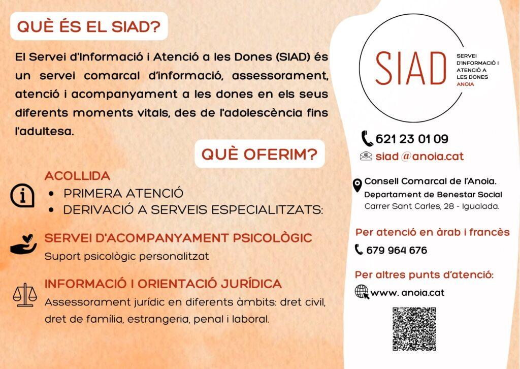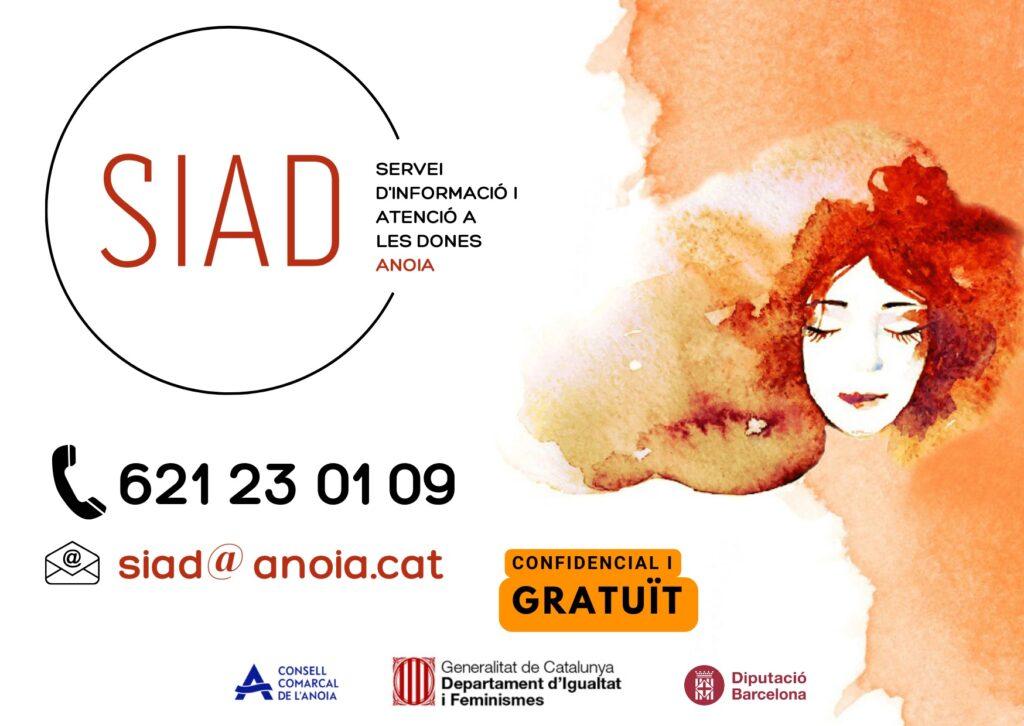Les dones poden sol·licitar cita prèvia a través del telèfon 621 23 01 09 o del correu electrònic siad@anoia.cat.