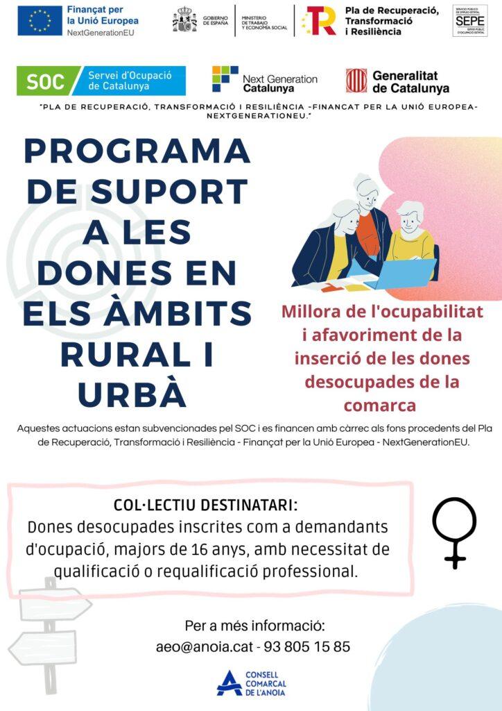El Departament de Promoció Econòmica del Consell Comarcal de l'Anoia, està executant des de l'1 de setembre de 2023 fins el 31 de maig de 2024un nou programa subvencionat pel SOC: Programa de Suport a les Dones en els àmbits rural i urbà. Aquest està subvencionat pel SOC i està finançat amb fons procedents del Pla de Recuperació, Transformació i Resiliència - Finançat per la Unió Europea - NextGenerationEU.