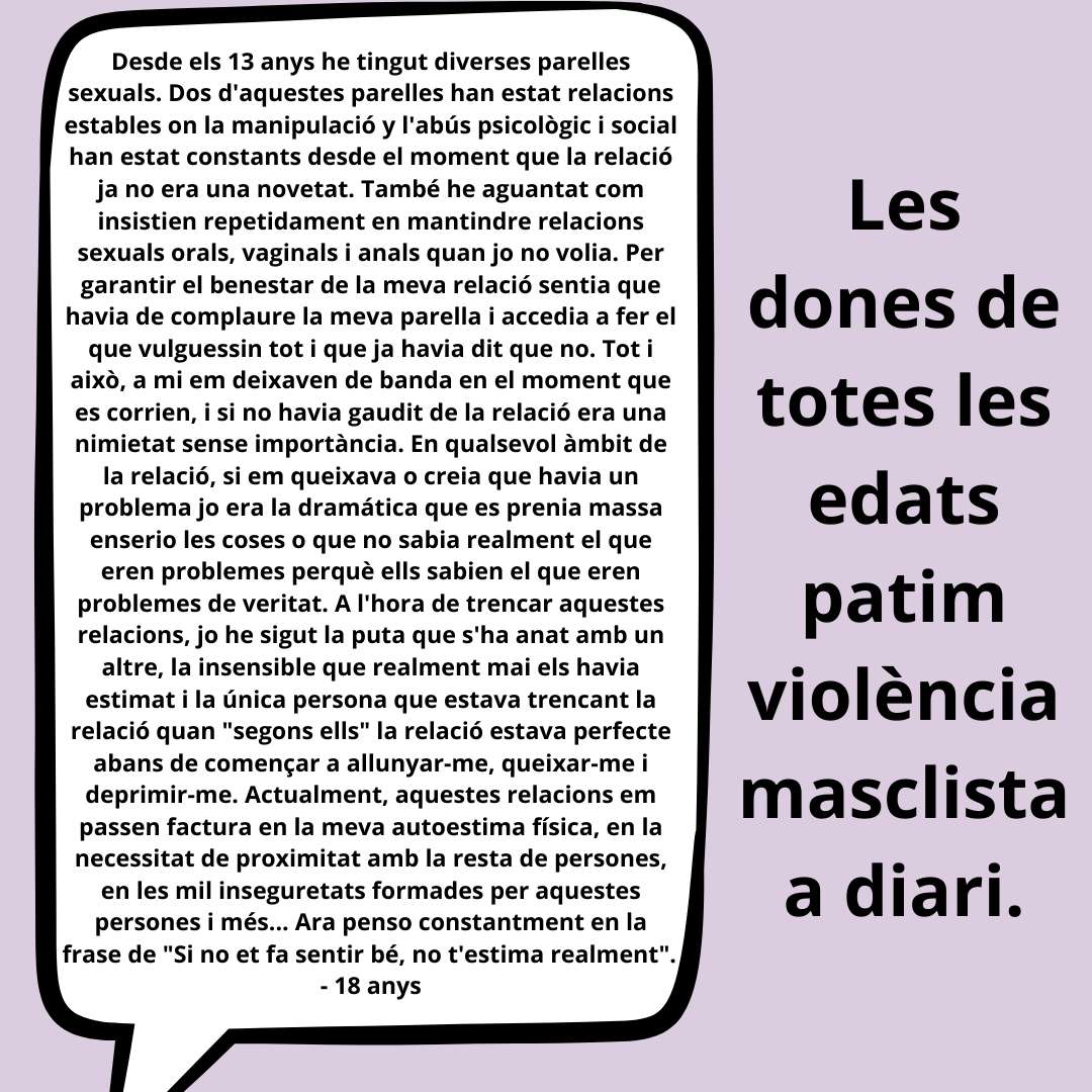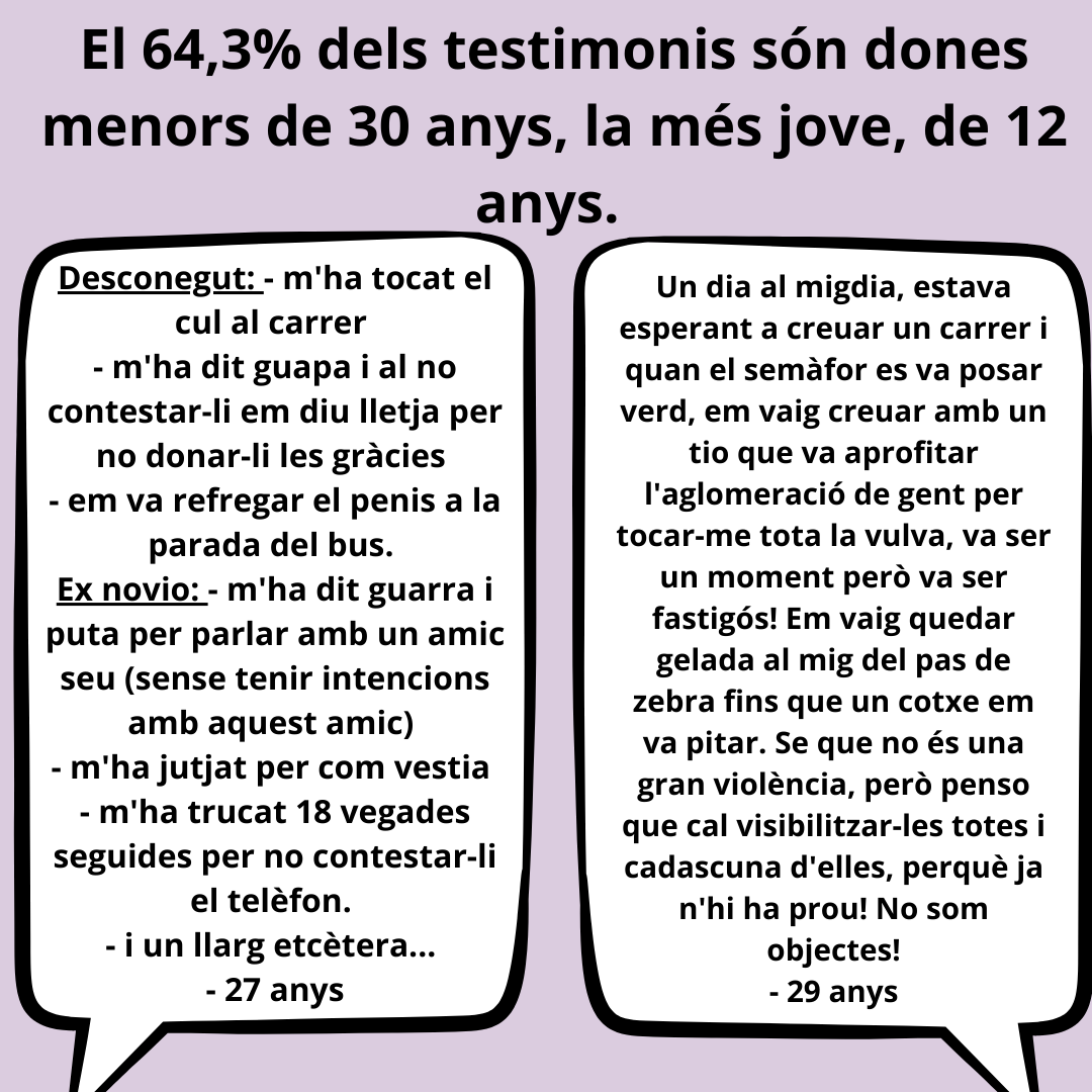 Dels primers resultats de la campanya, cal destacar que el 64,3% dels testimonis són de dones menors de 30 anys. La més jove, de 12 anys. Aquest fet, mostra que les violències masclistes existeixen, que dones de totes les edats les pateixen i, que sovint, les viuen des de la vergonya i la indefensió.