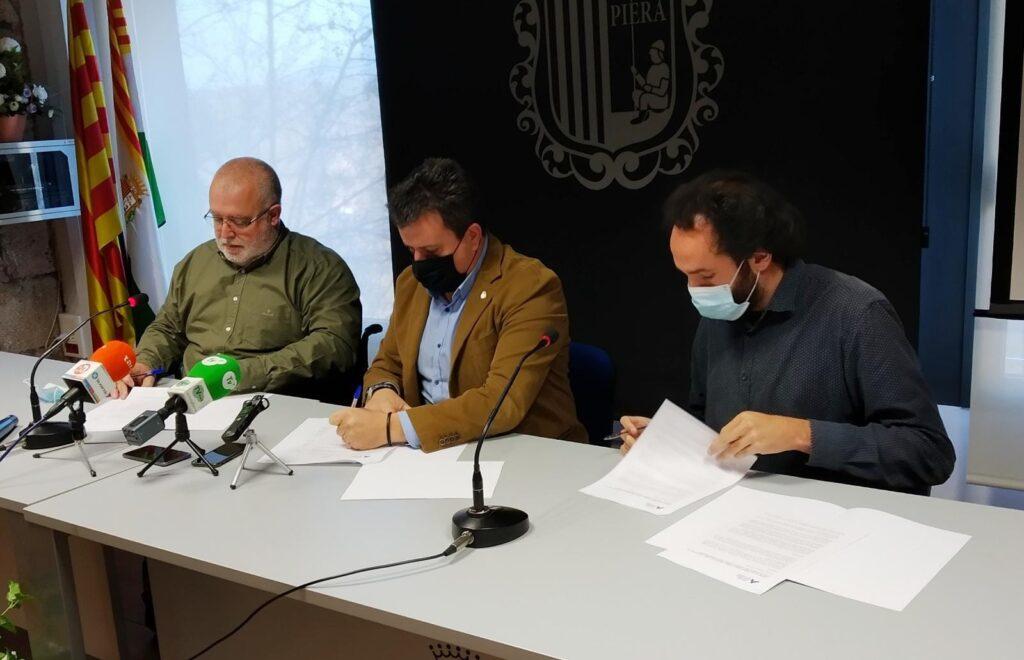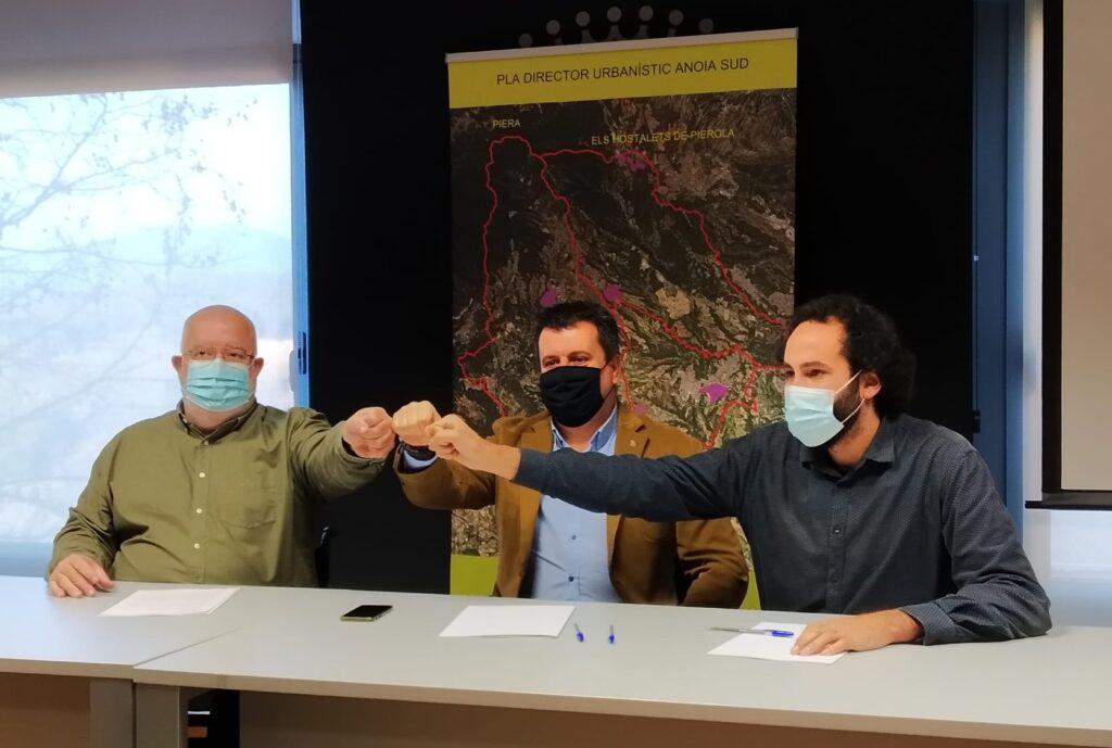 El Consell Comarcal de l’Anoia i els Ajuntaments de Piera, Masquefa i Els Hostalets de Pierola treballaran conjuntament per al desenvolupament de nou sòl destinat a l’activitat industrial. Aquest dijous, 20 de gener, han signat el conveni que suposa l’inici d’aquest procés l’alcalde de Piera, Josep Llopart, l’alcalde dels Hostalets de Pierola, Gerard Parcerisas, i l’alcalde de Masquefa i president del Consell Comarcal de l’Anoia, Xavier Boquete.