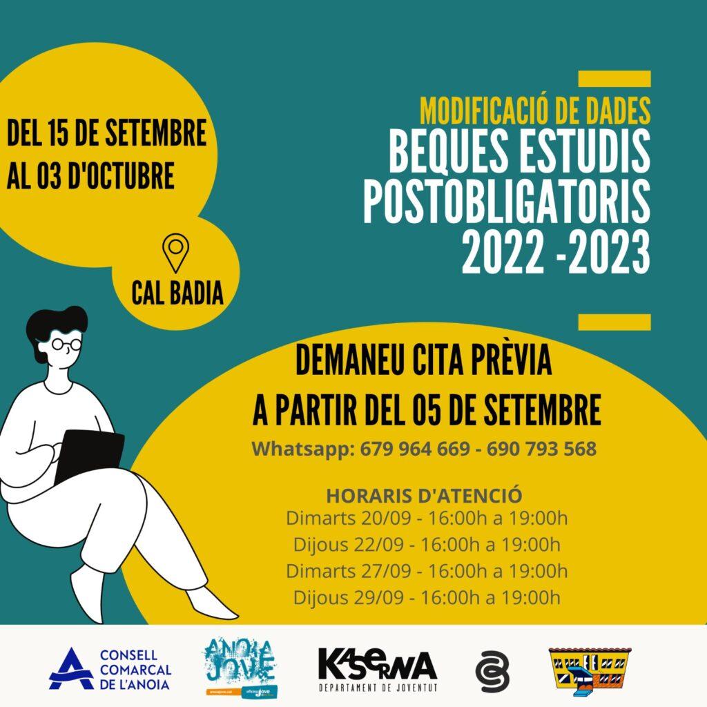El departament de Joventut de l’Ajuntament d’Igualada i l’Oficina Jove del Consell Comarcal de l’Anoia, s’ajunten novament per oferir el servei d’acompanyament en la modificació de dades de la Beca General del Ministeri d'Educació i Formació Professional per Estudis Postobligatoris i resoldre els dubtes que puguin sorgir.