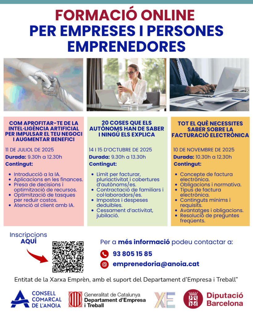 El Consell Comarcal de l'Anoia, a través del seu Departament de Promoció Econòmica, posa en marxa tres noves sessions formatives gratuïtes per donar suport a emprenedors i empreses de la comarca.