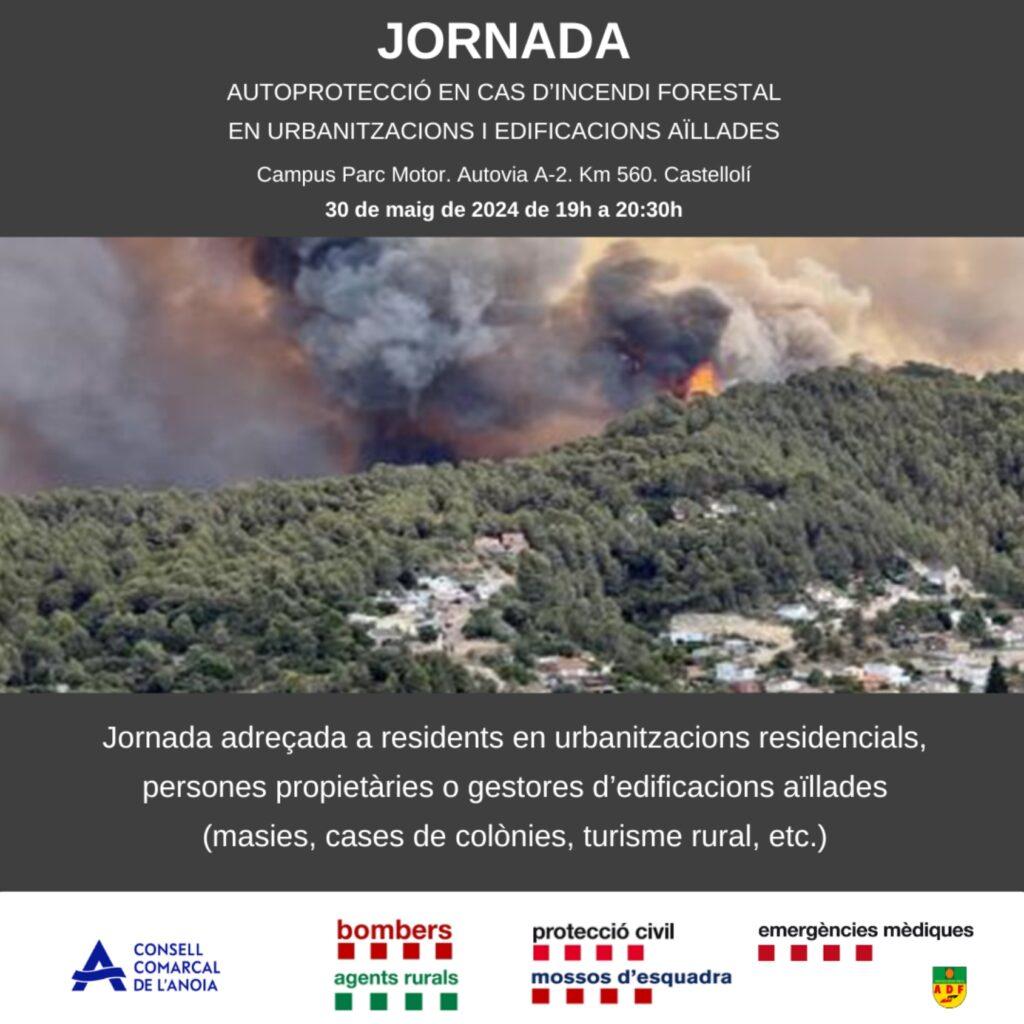 El Consell Comarcal de l'Anoia organitza una jornada d'autoprotecció en cas d'incendi forestal en urbanitzacions i edificacions aïllades el proper 30 de maig de 2024, de 19h a 20:30h, al Campus Parc Motor de Castellolí. Aquesta jornada, que és gratuïta i està oberta a tothom, va dirigida especialment a residents en urbanitzacions, persones propietàries o gestores d’edificacions aïllades. La jornada anirà a càrrec de professionals dels Bombers, Agents Rurals, Protecció Civil, Mossos d'Esquadra, emergències mèdiques i les ADF de l'Anoia.