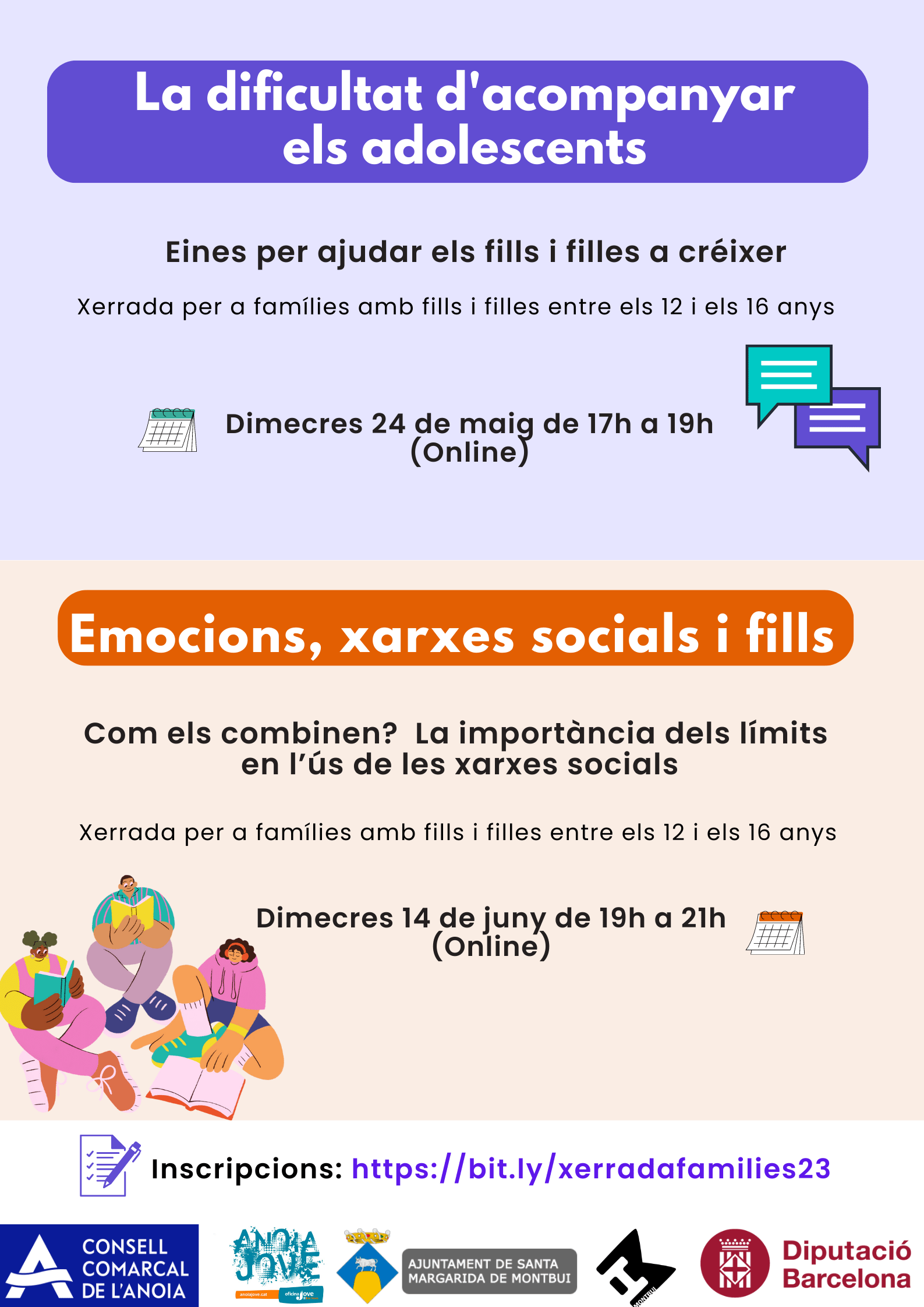 L'Oficina Jove del Consell Comarcal de l'Anoia i l'Ajuntament de Santa Margarida de Montbui, amb el suport de la Diputació de Barcelona, organitza dues xerrades dirigides a pares i mares de joves adolescents dins del programa de suport a la funció educativa de les famílies.