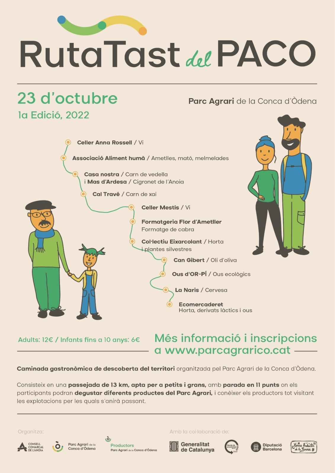 El següent cap de setmana, diumenge dia 23 d’octubre, tindrà lloc el RutaTast del PACO, una passejada de 13 km apta per a petits i grans, fent parada en onze punts on els participants podran degustar diferents productes del Parc Agrari de la Conca d’Òdena en format de delicioses tapes, així com vins i cerveses de la zona. Algunes d’aquestes parades estaran situades a les mateixes explotacions agràries, que es podran visitar.