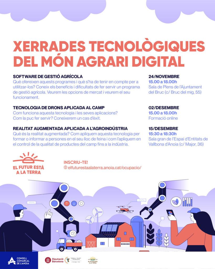 El programa Treball, Talent i Tecnologia (TTT), impulsat pel Consell Comarcal de l'Anoia amb el suport de la Diputació de Barcelona i la participació de més d’una vintena de municipis del territori, proposa als mesos de novembre i desembre un seguit de ponències, que, sota el títol Xerrades Tecnològiques del Món Agrari Digital, permetran ampliar coneixements en aquest camp. La informació detallada de cadascuna i el formulari d’inscripció es poden trobar al web elfuturestaalaterra.anoia.cat/ocupacio.