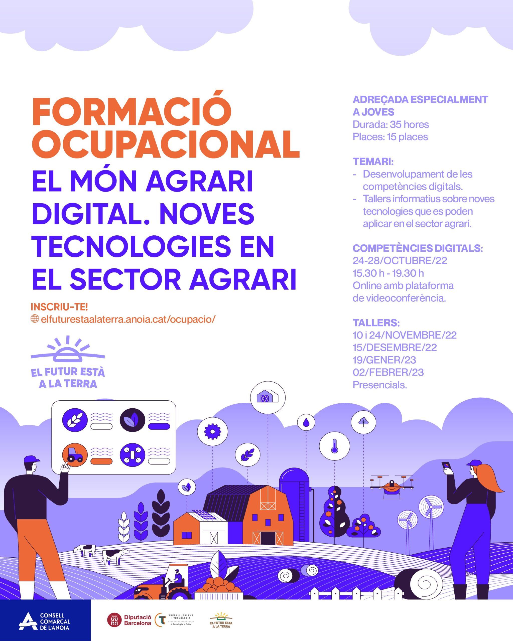 La primera formació és El món agrari digital. Noves tecnologies en el sector agrari, una acció enfocada especialment als joves que vol potenciar el coneixement de noves alternatives de feina en la part primària de la cadena de valor i potenciar la seva motivació per treballar en el sector. Compta amb 15 places i té una durada de 35 hores, desenvolupant la part teòrica —en línia— entre el 24 i el 28 d’octubre i la pràctica —tallers presencials— entre els mesos de novembre i febrer de 2023.