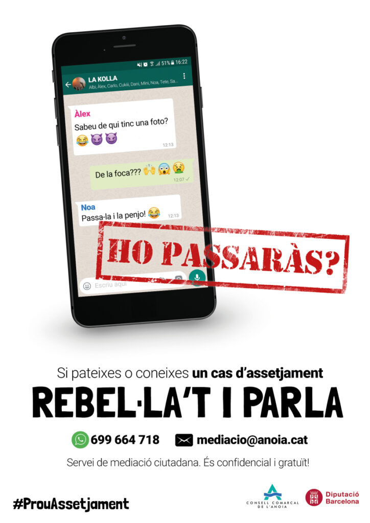 El Servei de Mediació Ciutadana de l’Anoia pot atendre casos de bullying i ciberbullying de forma confidencial i gratuïta. El contacte es pot fer a través de l’adreça mediacio@anoia.cat o bé al telèfon 699 664 718.