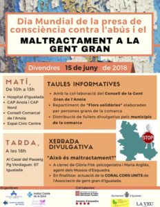 El Consell Comarcal de l’Anoia, juntament amb l’ Institut Català de la Salut, el Consorci Socio Sanitari d’Igualada i la Fundació Sanitària Sant Josep i, amb el suport de l’Ajuntament d’Igualada,del Casal del Passeig,i mitjans de comunicació, organitzen accions de sensibilització en el “Dia Mundial de la presa de consciència contra els maltractaments a les persones grans” que és el divendres 15 de juny.