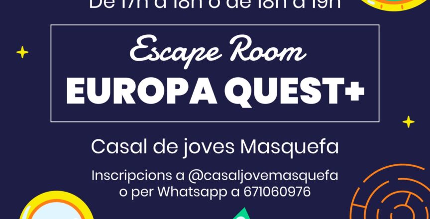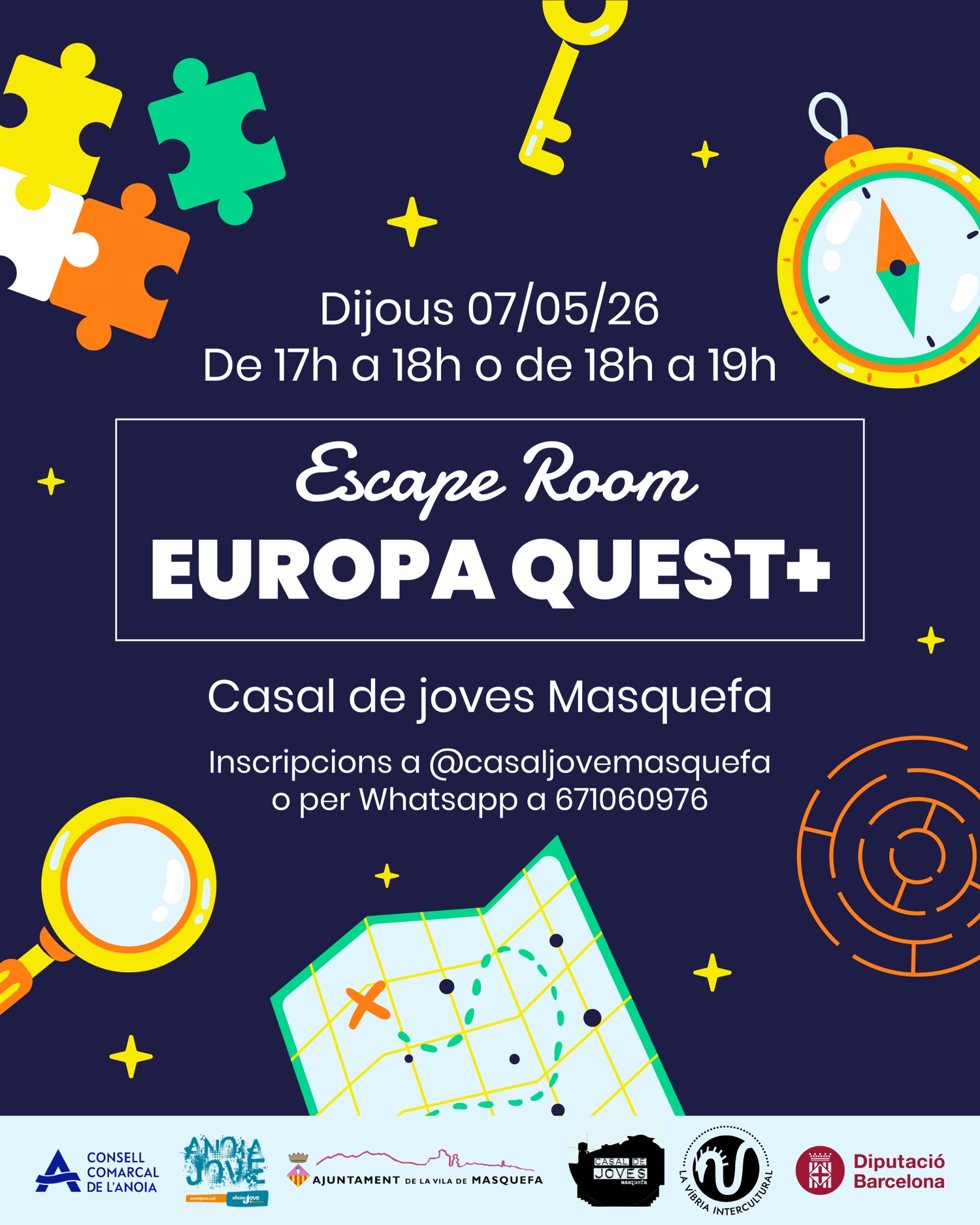 El proper dijous 7 de maig, l’Oficina Jove del Consell Comarcal de l’Anoia, amb el suport de la Diputació de Barcelona, organitza l’activitat “Europa Quest+”, un Escape Room dinamitzat per La Víbria Intercultural. L’esdeveniment tindrà lloc al Casal de Joves de Masquefa, situat al carrer Santa Clara, 16-22, dins del complex La Fàbrica Rogelio Rojo, en dos torns: de 17 a 18 h i de 18 a 19 h.