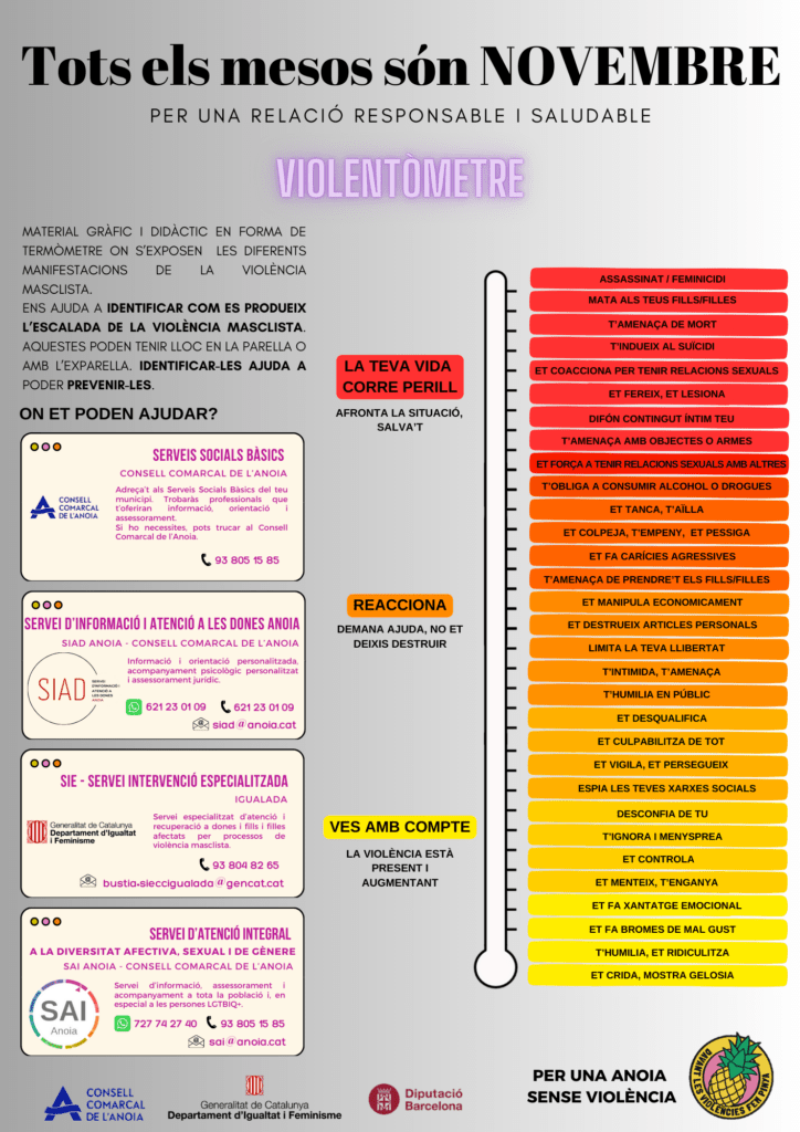A la seu de la plaça Sant Miquel, així com a la seu del C/Sant Carles 28 d’Igualada, podeu trobar exemplars disponibles dels violentòmetres en diferents llengües.